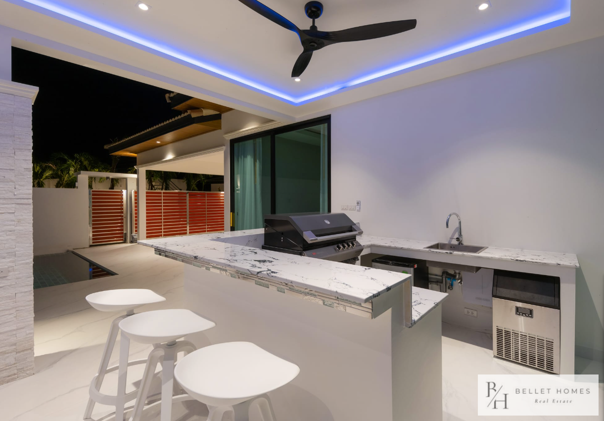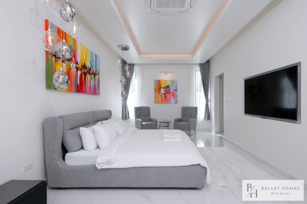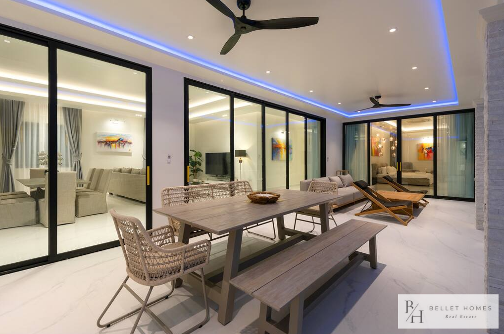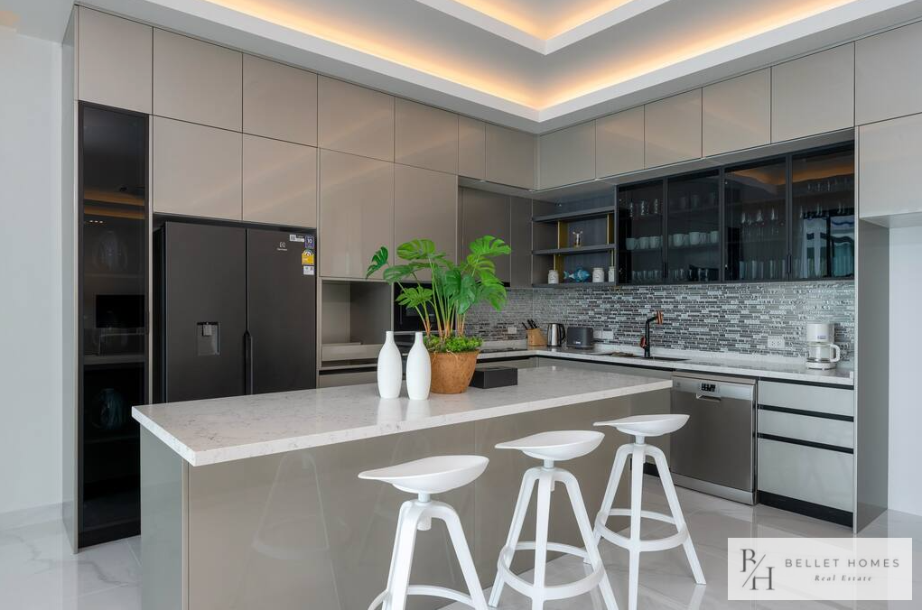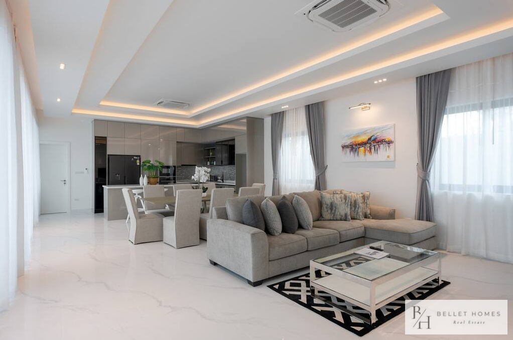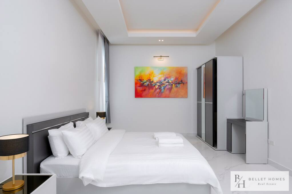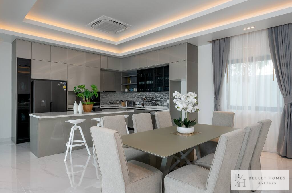 • 5 bedrooms / 3 bathrooms (1 ensuite with bathtub & walk-in wardrobe) • Spacious living & dining area • 65″ Smart TV • Fully equipped European kitchen with island & wine cooler • Free high-speed WiFi & 3BB TV box • Washing machine • Carport