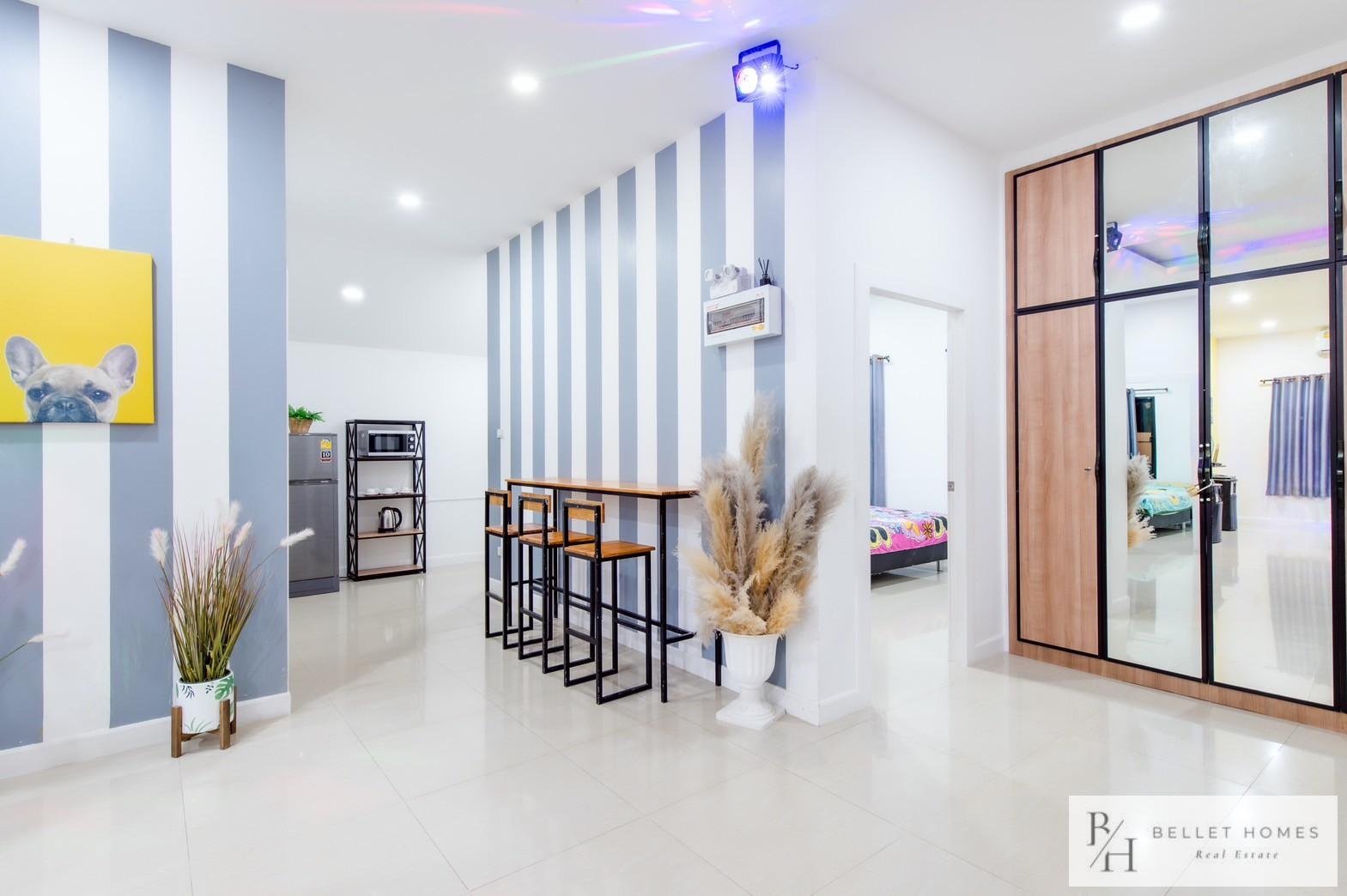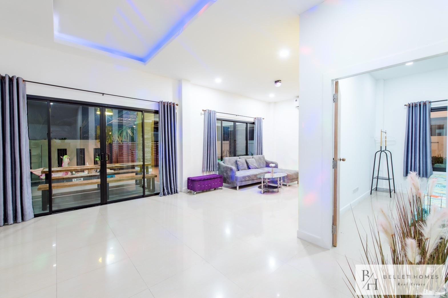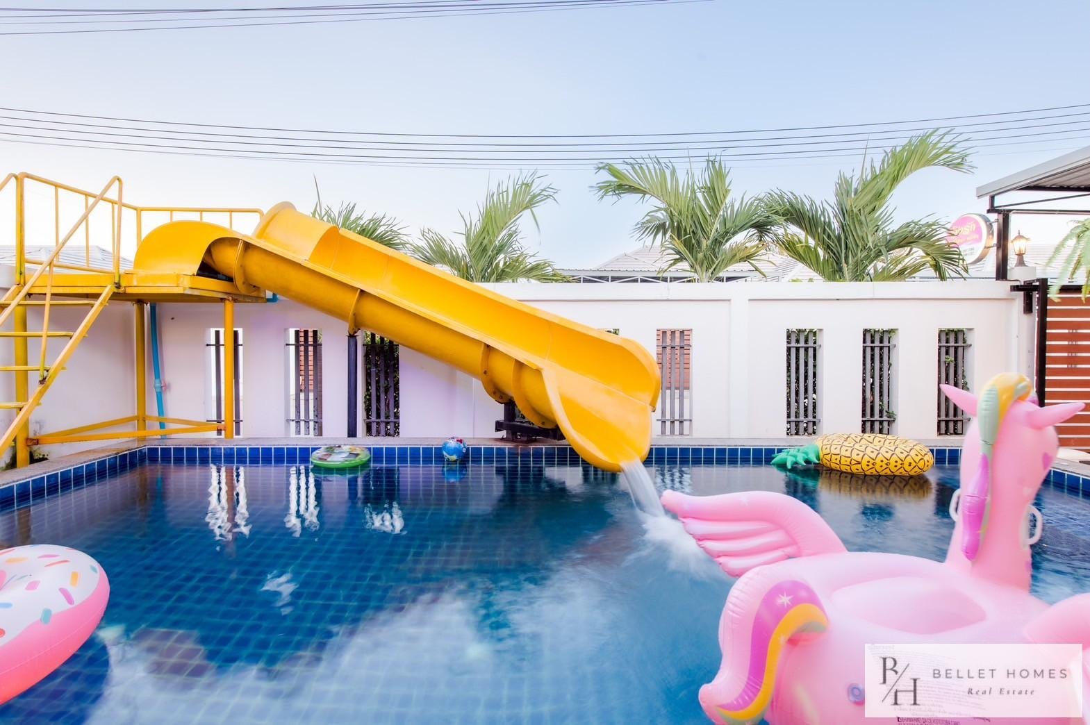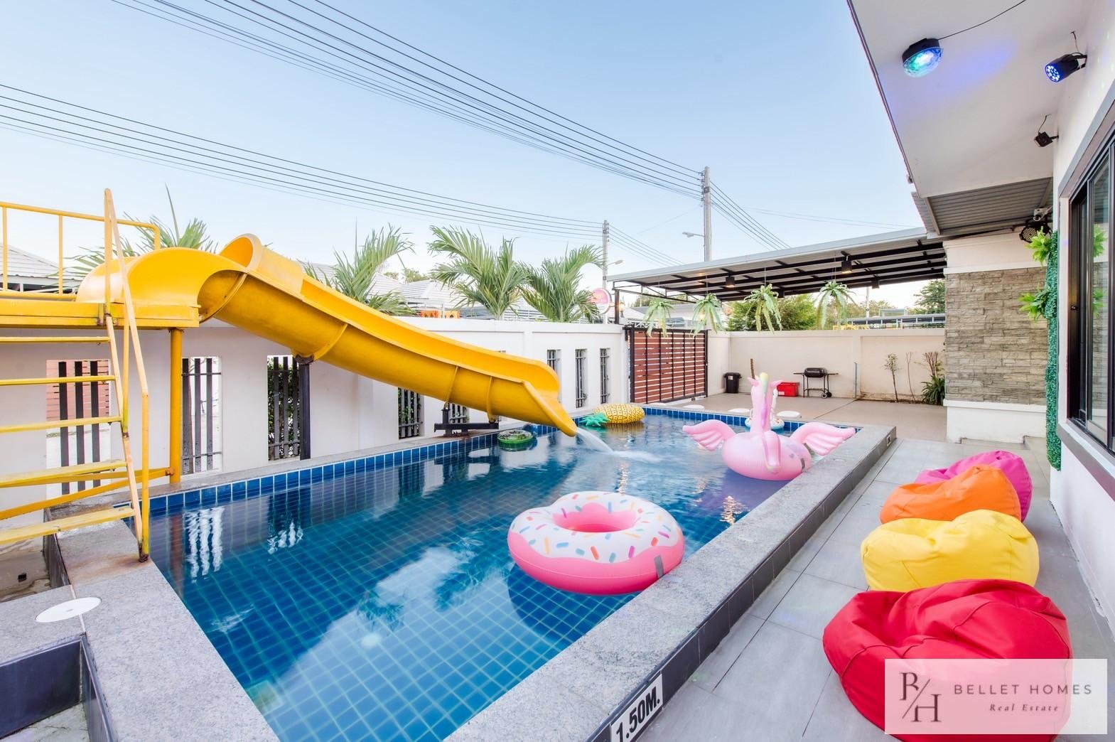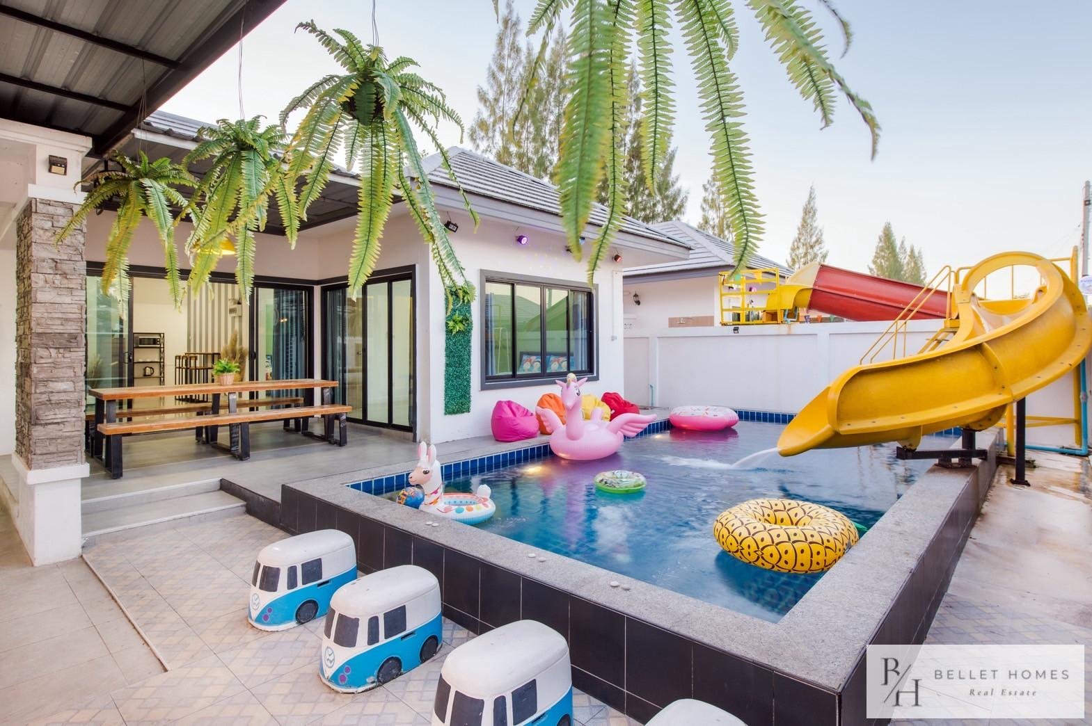 This private pool villa is located in the peaceful Hin Lek Fai area, offering a comfortable and well-equipped living space suitable for families or long-term stays. The property features a private swimming pool with a slide, outdoor Thai kitchen, and entertainment facilities, creating a relaxed lifestyle close to Hua Hin town.