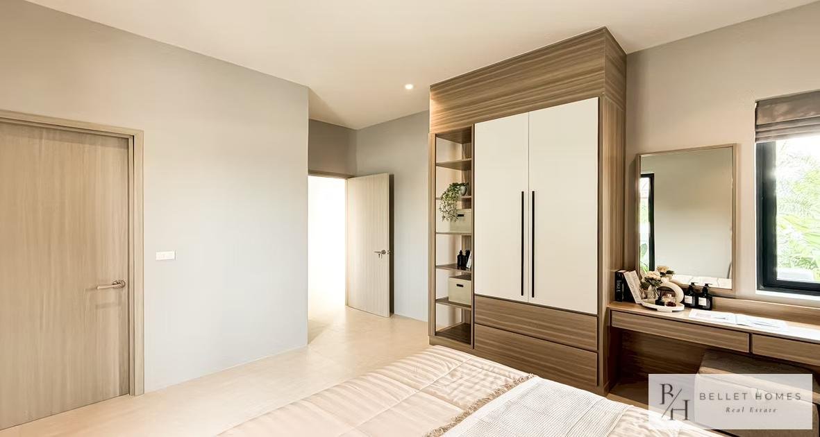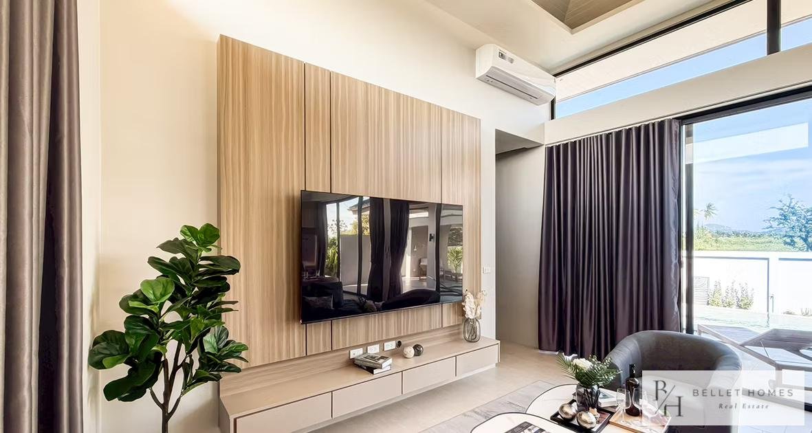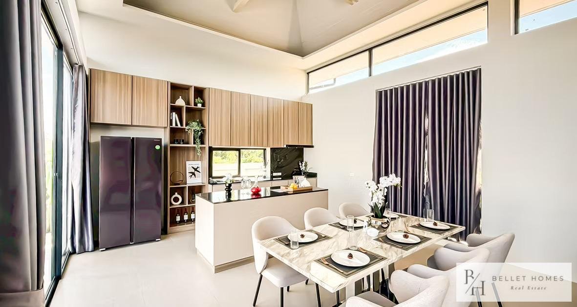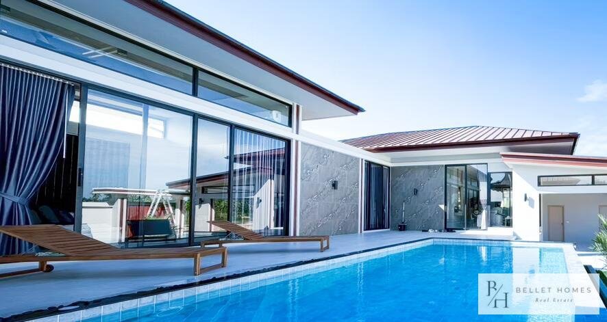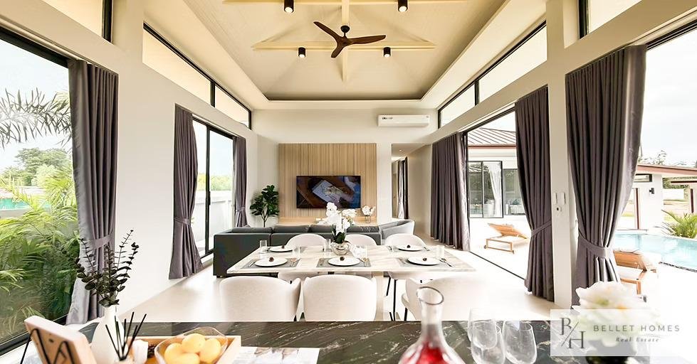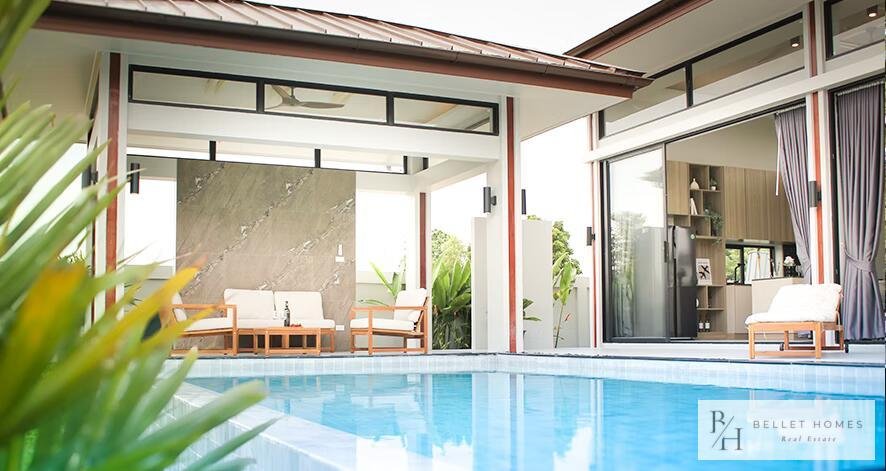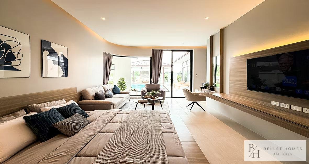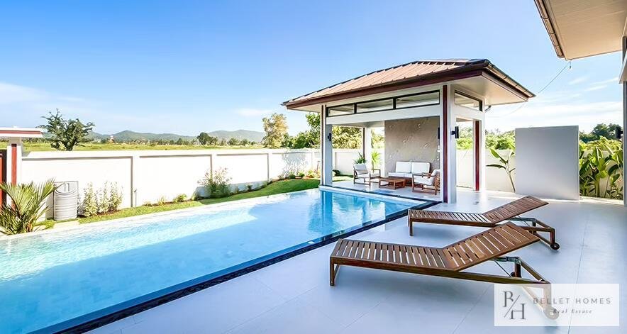 This luxury private pool villa is located in Wang Phong Soi 12, offering a peaceful mountain-view setting surrounded by natural landscapes. The property provides convenient access from two main routes and is close to local shops and a 7-Eleven within walking distance. Designed with an open-plan layout, the villa features spacious living, dining, and kitchen areas that create a bright and comfortable atmosphere. With European-standard construction and thoughtful design, this home is ideal for family living or long-term residence.
