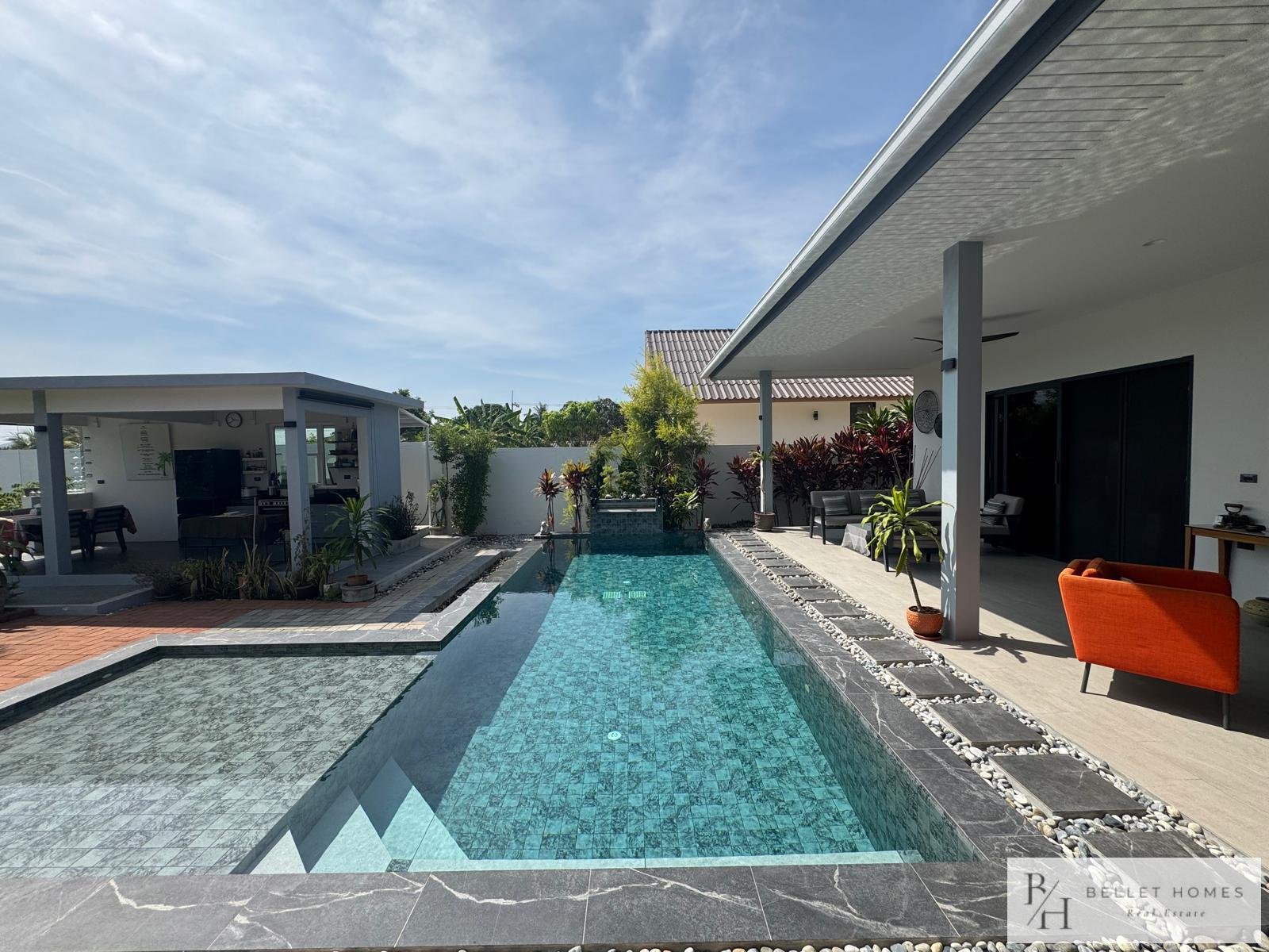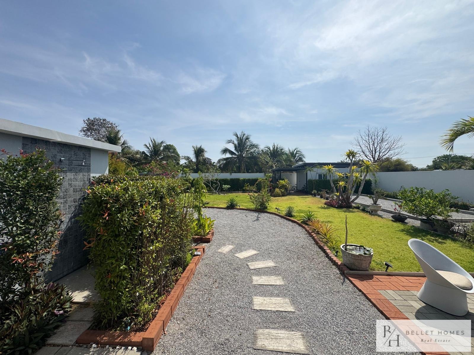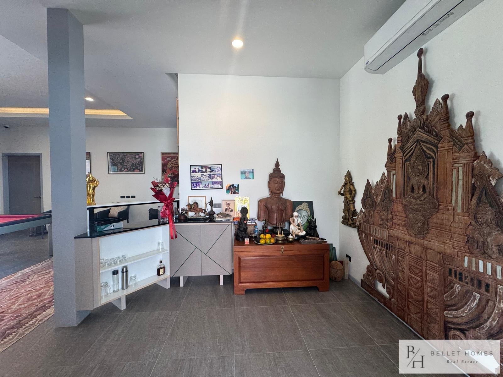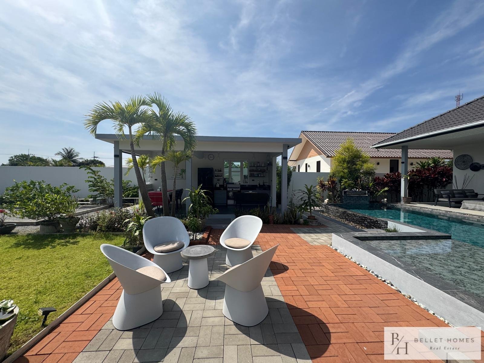 • 3 bedrooms • 3 bathrooms • Land size: 1,200 sq.m. • Living area: 400 sq.m. • Private swimming pool • Large storage room • Island-style European kitchen • Fully furnished • Beautifully decorated interior • Red Chanote title deed