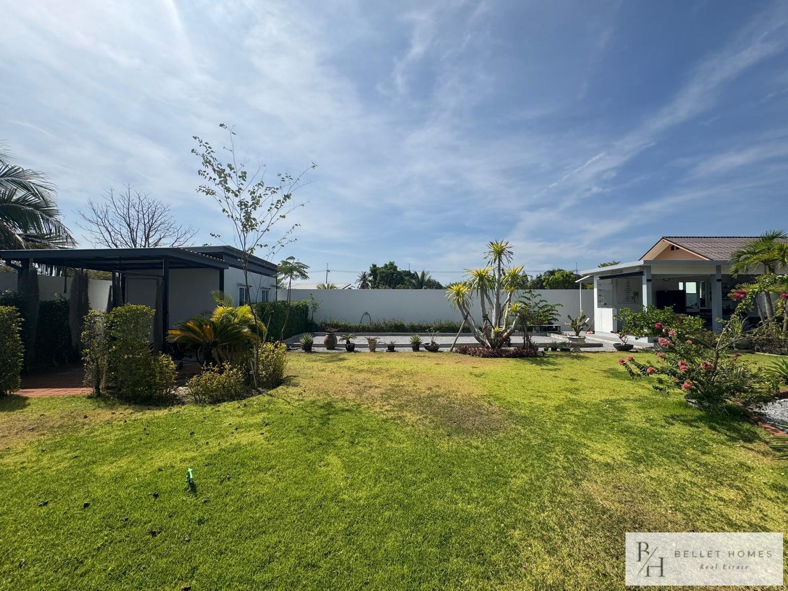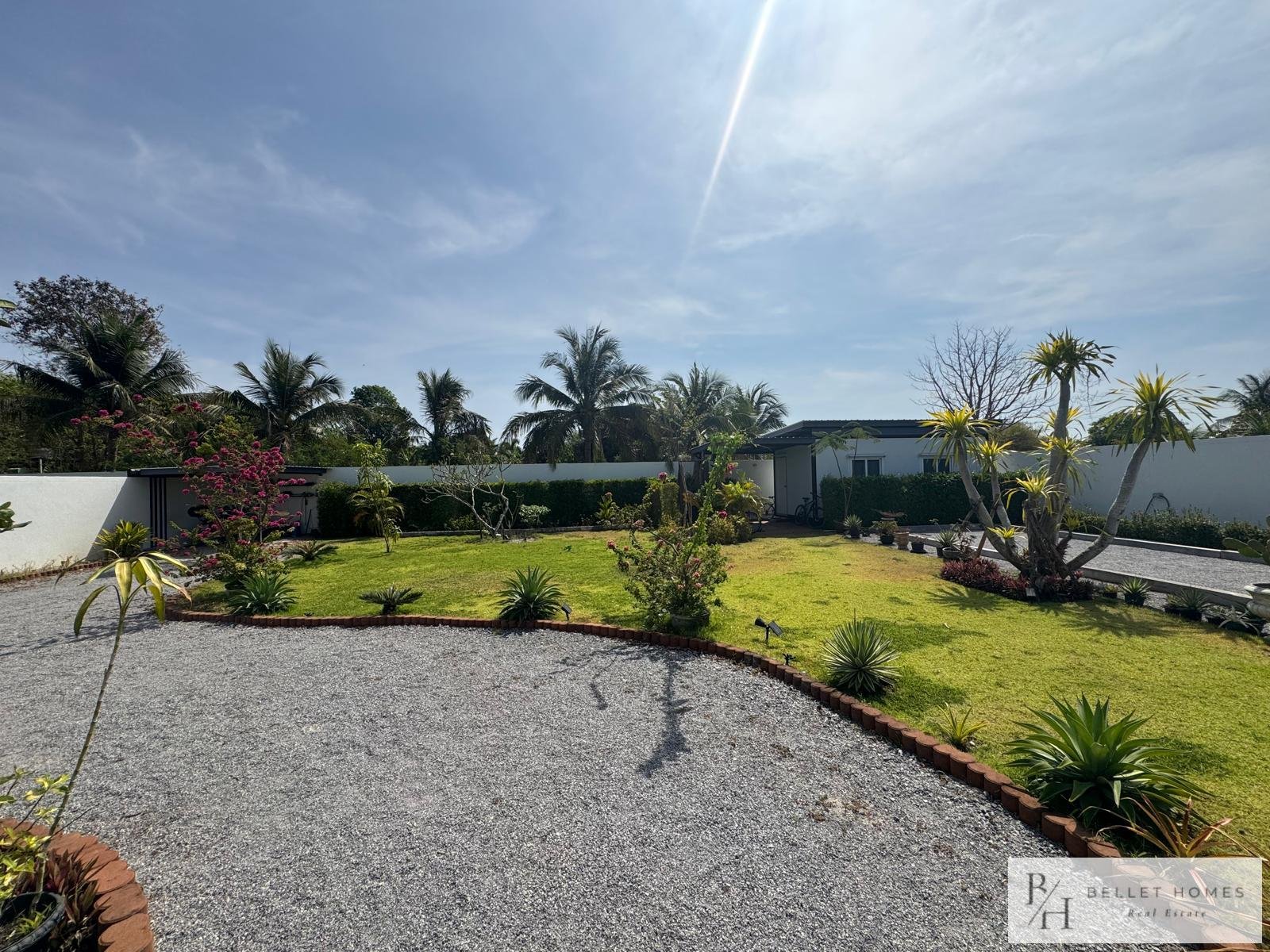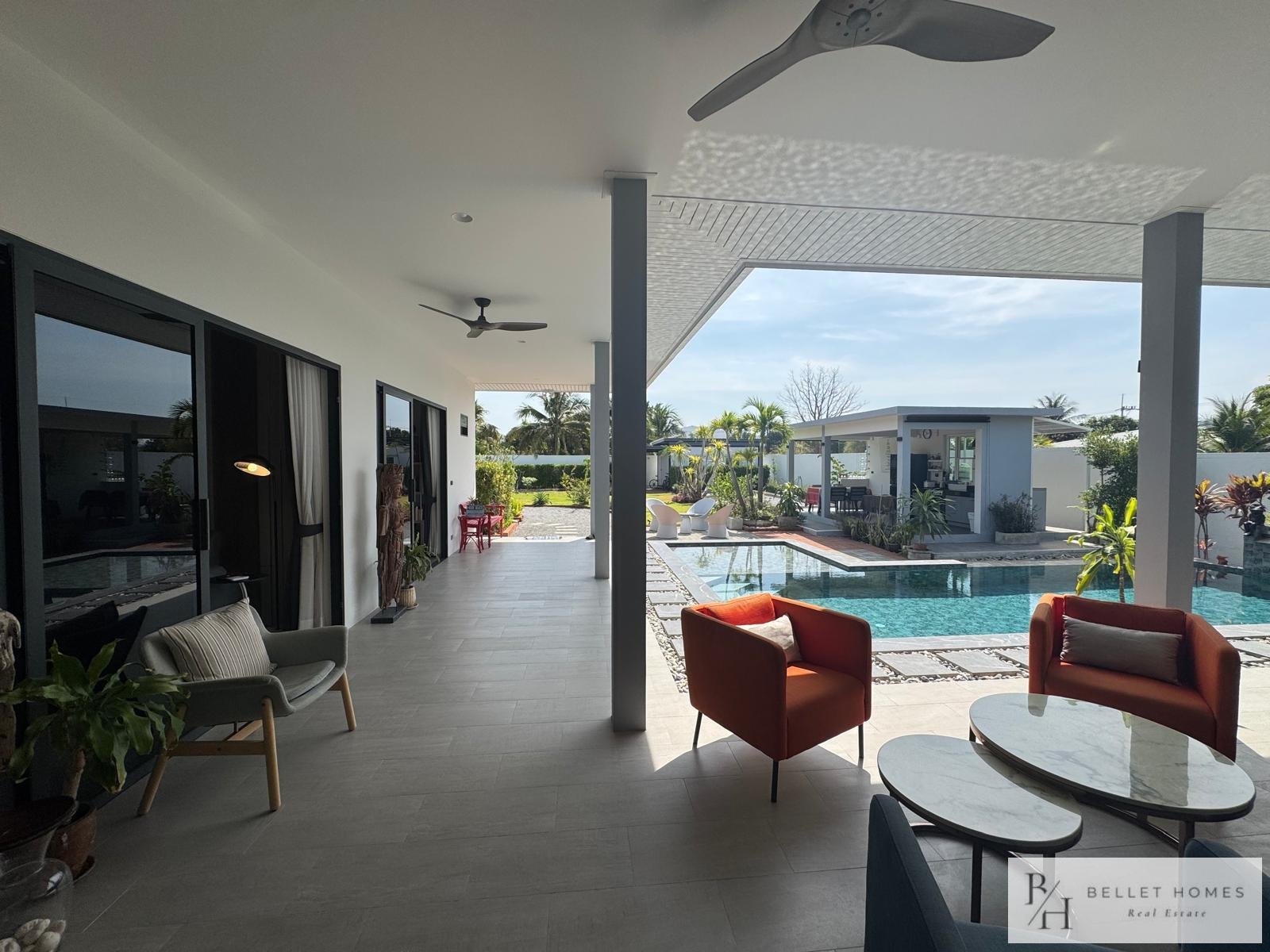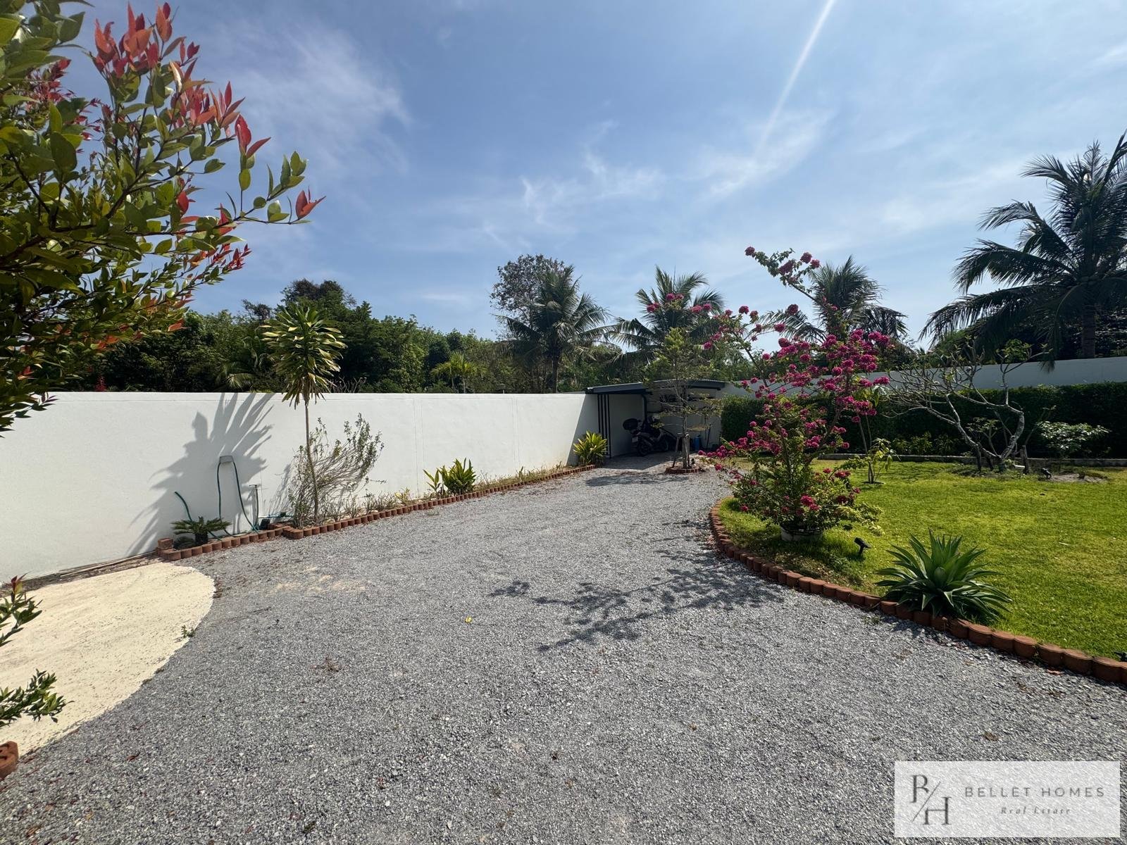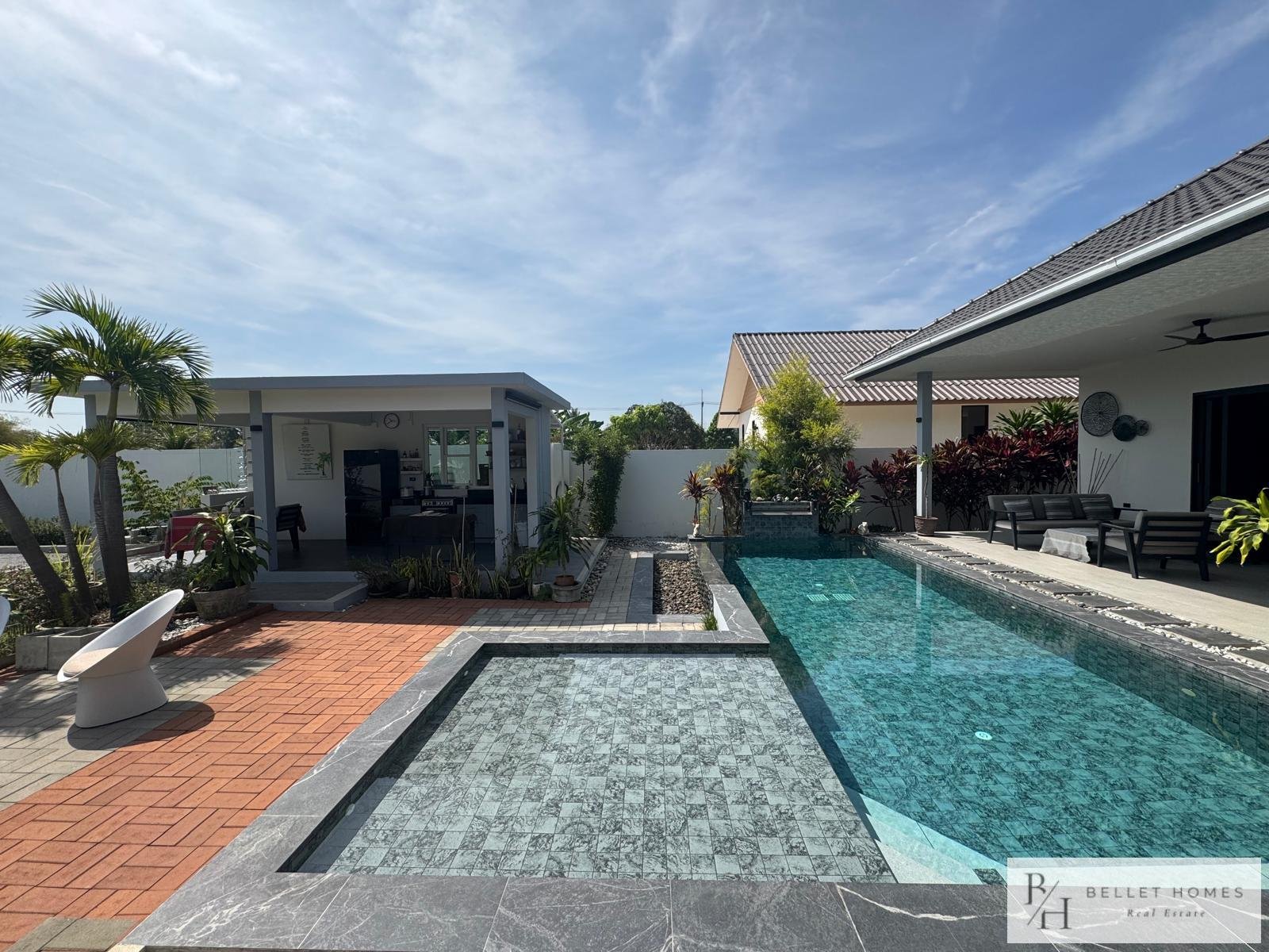 • 3 bedrooms • 3 bathrooms • Land size: 1,200 sq.m. • Living area: 400 sq.m. • Private swimming pool • Large storage room • Island-style European kitchen • Fully furnished • Beautifully decorated interior • Red Chanote title deed